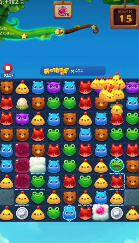开局时系统提供的竖线特效和爆炸特效是宝贵的资源,将它们结合使用可以产生消除四列的强大效果,能有效清除底部的冰块并打破蜂蜜罐。初始操作应围绕利用这些特效来打开被封锁的局面,优先消除障碍物让动物顺利下落。由于关卡中鸡窝是生成小黄鸡的重要来源,在开局阶段就可以利用特效去激活鸡窝,让小黄鸡不断产出,这为后续在右侧区域形成更多特效和魔力鸟创造了条件。